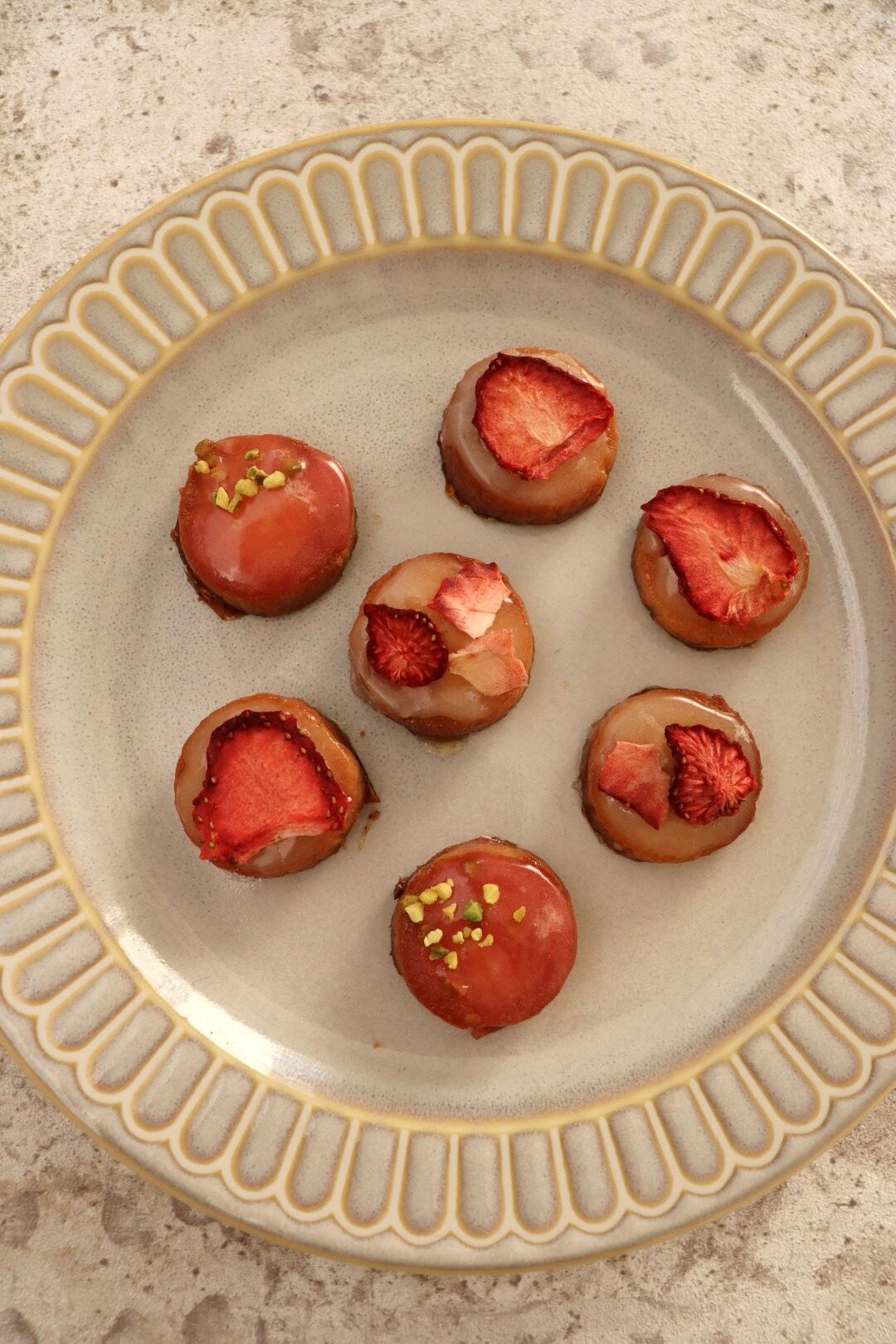 バター、砂糖、卵、アーモンド、いちご、いちごパウダー、ピスタチオ